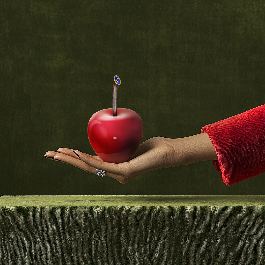 Cennet Bahçesi anlatısında bilgi ve aydınlanmayı temsil eden elma, koleksiyonda bilgelik ve bilinç için güçlü bir metafor haline geliyor.