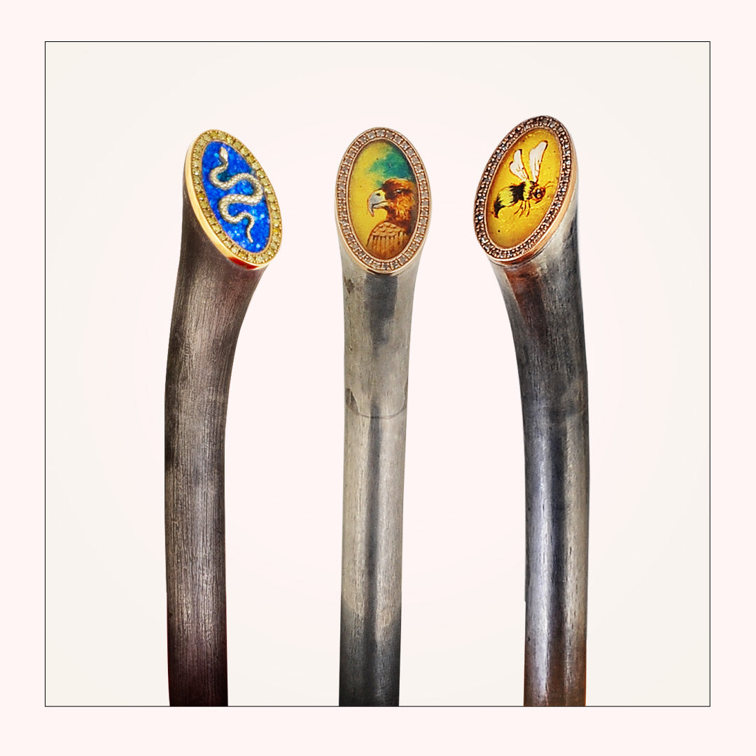 Değerli taşlarla süslenmiş, anlam yüklü özgün figür tasarımları.