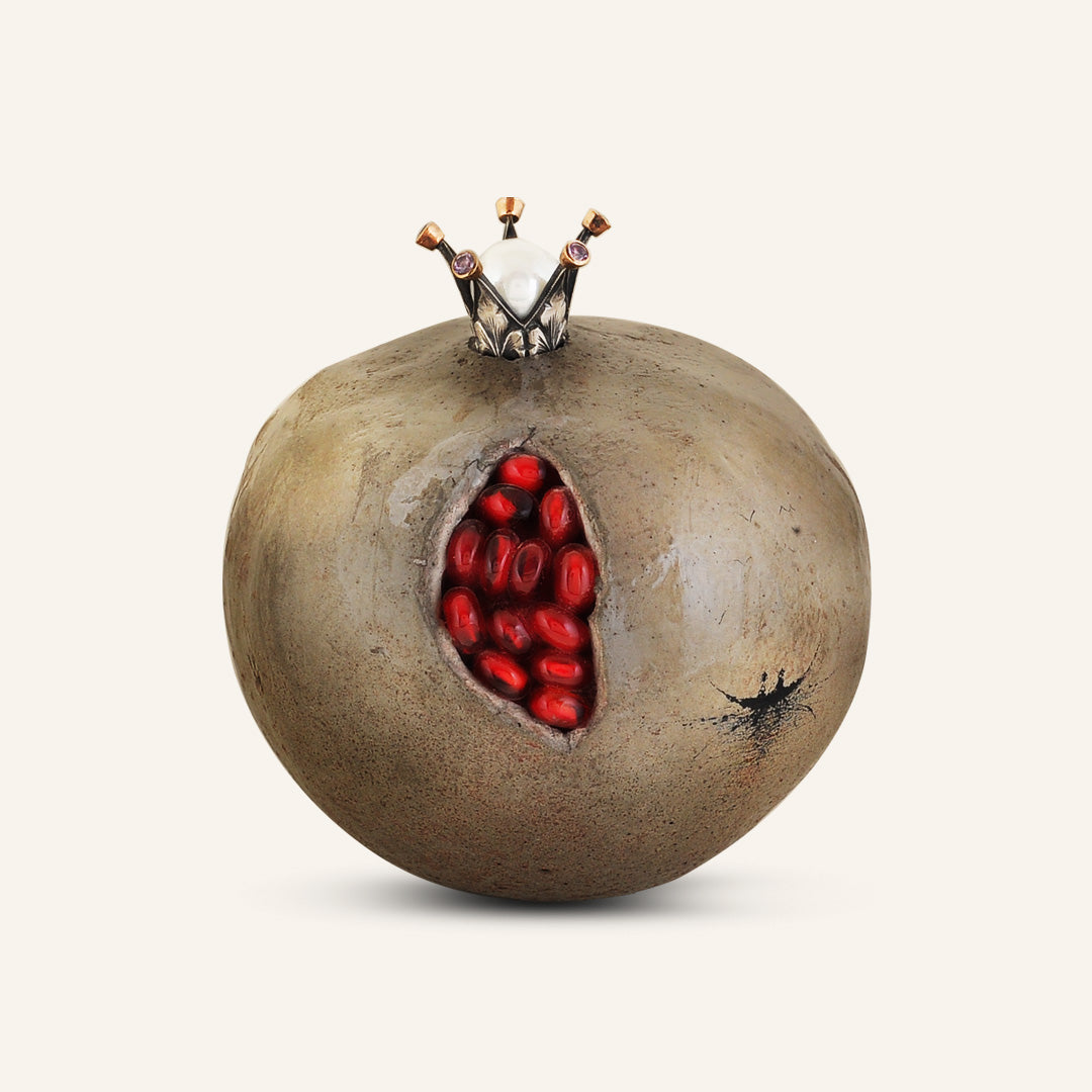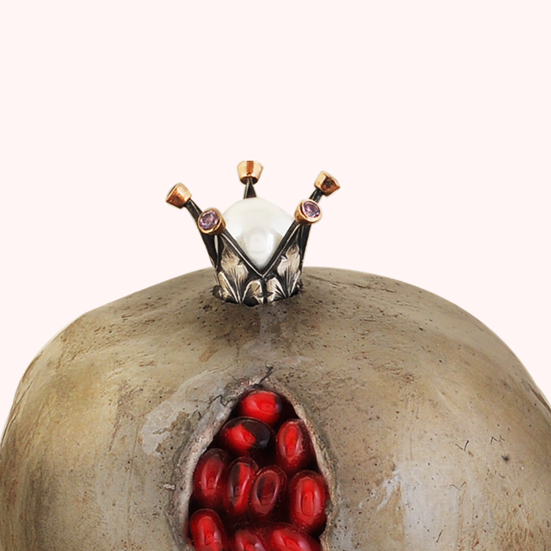 Nar, bereket, doğurganlık, yaşam döngüsü ve yeniden doğuş anlamlarını taşır. Üzerine yerleştirilen safir taşlı gümüş taç, güç, statü ve bilgeliği simgelerken, merkezdeki inci, zarafet ve saflığın sembolüdür.