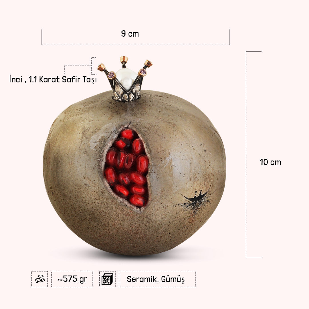 Bu özel tasarım nar, geleneksel bereket sembolünü kayık figürüyle birleştirerek anlamına yeni bir boyut katıyor. Taç şeklindeki sap detayı, el işçiliğinin inceliğini vurgularken, zamansız bir estetik sunuyor.