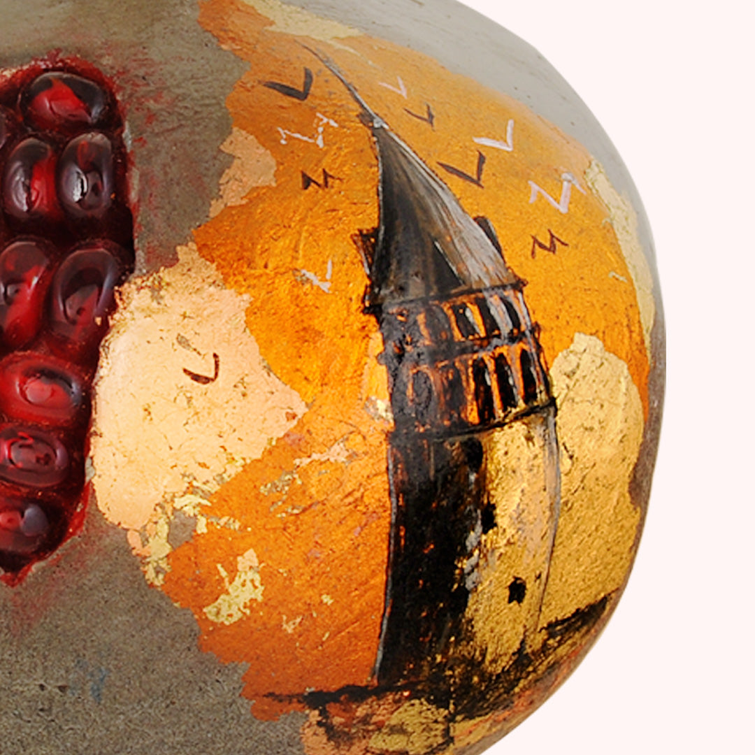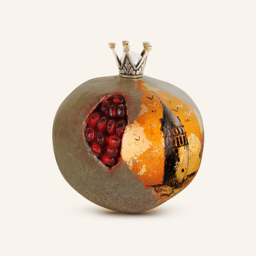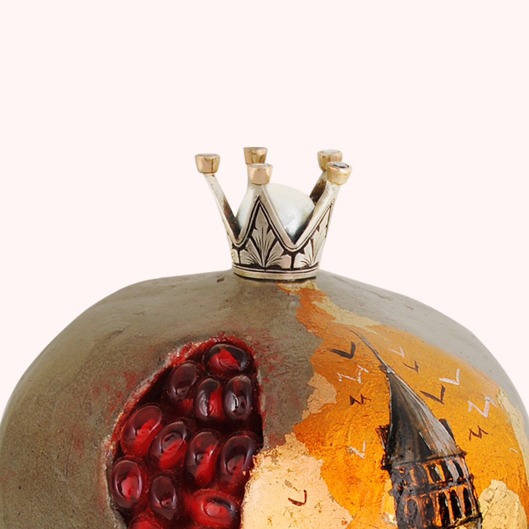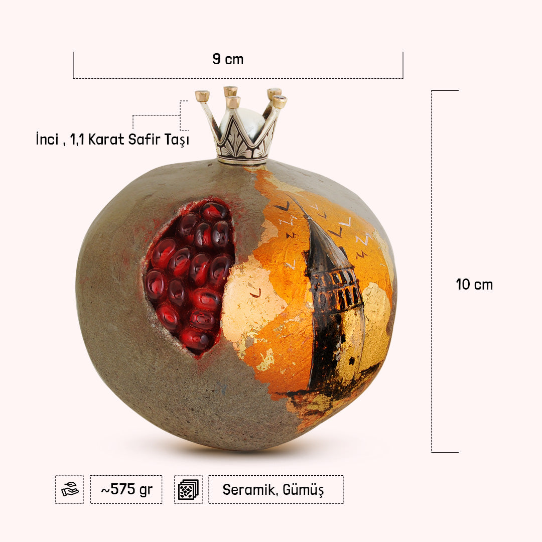 Bu seramik nar ve safir taşlı gümüş taç heykelciği, yalnızca dekoratif bir obje değil, aynı zamanda bilgeliğin, bereketin ve zamansız İstanbul ruhunun bir yansımasıdır. Evinize zarafet ve anlam dolu bir dokunuş katacak.