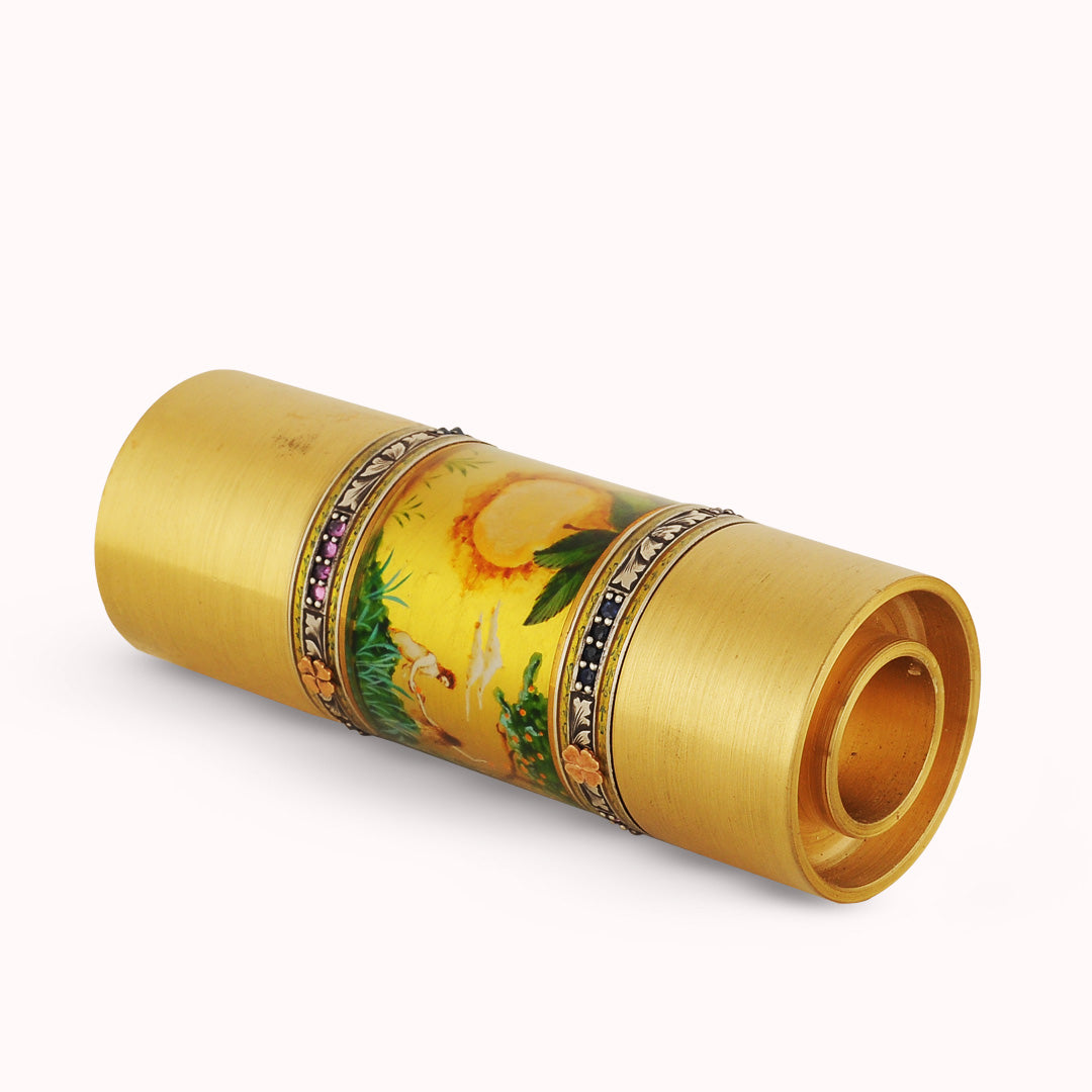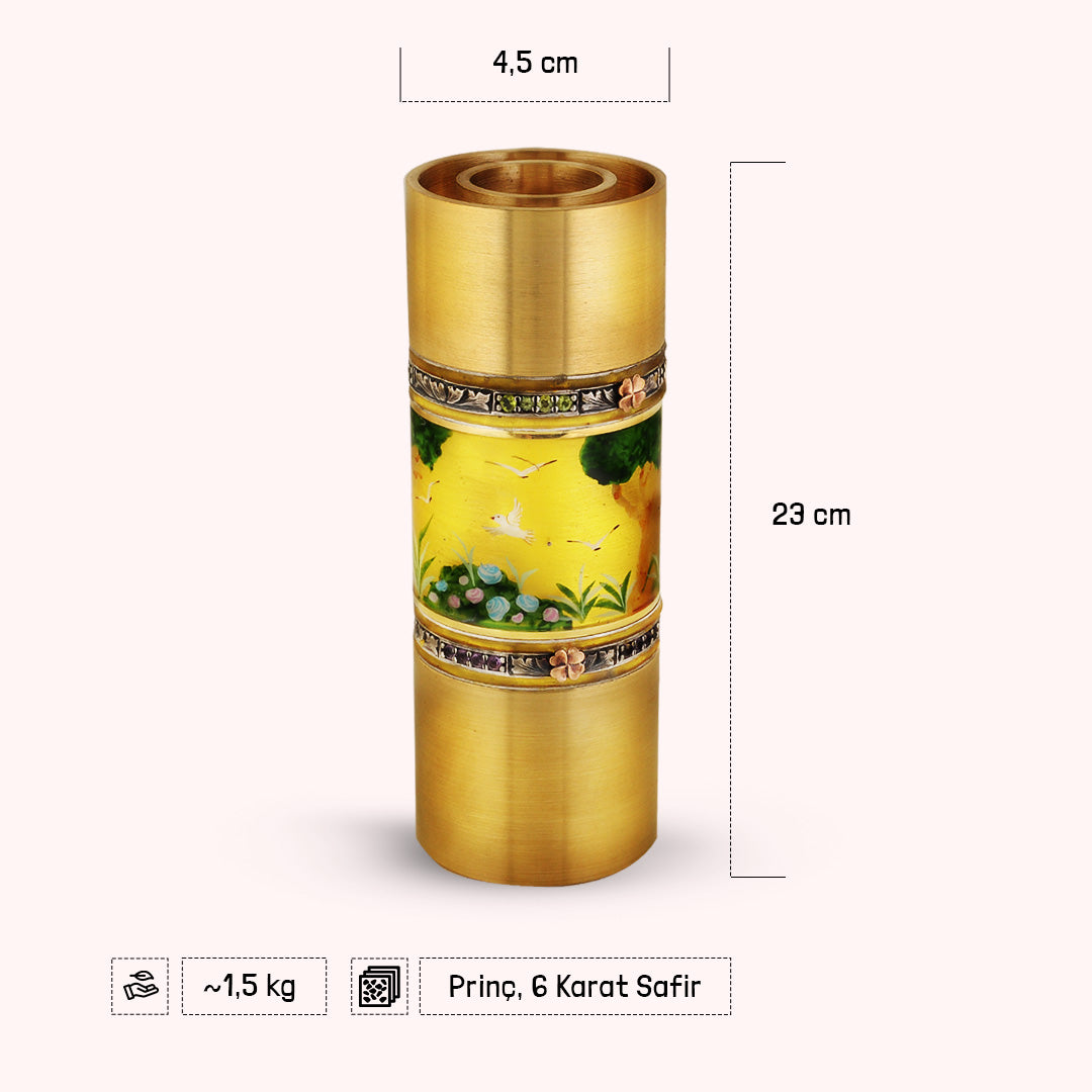 Bu zarif sanat eseri, lüks ve incelikle tasarlanmıştır. Safir taşlı, dört yapraklı yonca motifli bronz şamdan, şans, bilgelik, denge ve ruhsal aydınlanmayı simgeler. İlhamını, insanlık tarihinin en eski hikâyelerinden biri olan Adem ile Havva’nın aydınlanma yolculuğundan alır.